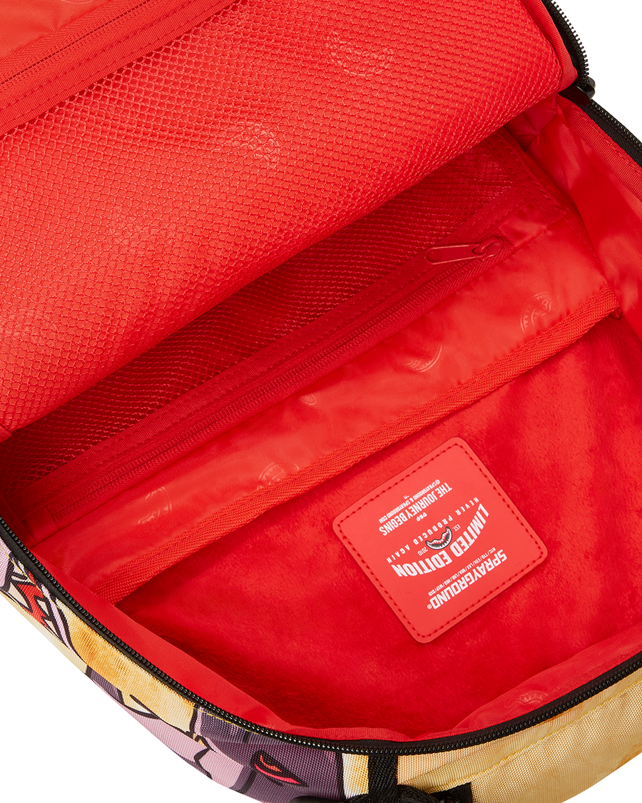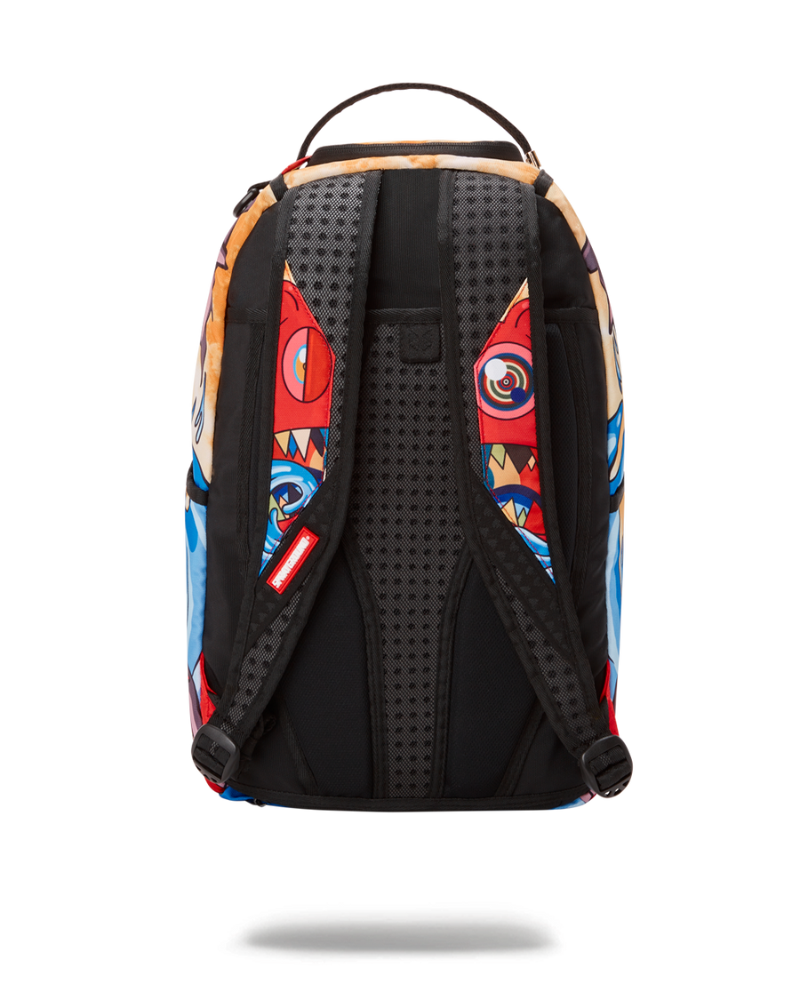 ExteriorDimensions: 18" x 6" x 11.5" • Front zipper pocket • Side pockets • Zippered Stash pocket • Separate velour sunglass compartment • Ergonomic mesh back padding • Adjustable Straps for custom sizing • Green zippers with metal hardware • Metal "Sprayground Authentic" badge • Slide through back sleeve connects to carry on luggage to free your hands