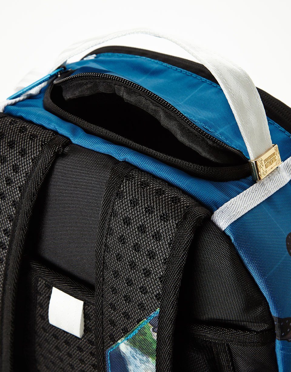 ExteriorDimensions: 18" x 6" x 11.5" ∙ Front zipper pocket ∙ Side pockets ∙ Zippered Stash pocket ∙ Ergonomic mesh back padding ∙ Adjustable Straps for custom sizing ∙ Nylon Zippers with Metal Hardware ∙ Metal "Sprayground Authentic" badge ∙ Slide through back sleeve connects to Carry on luggage to free your hands