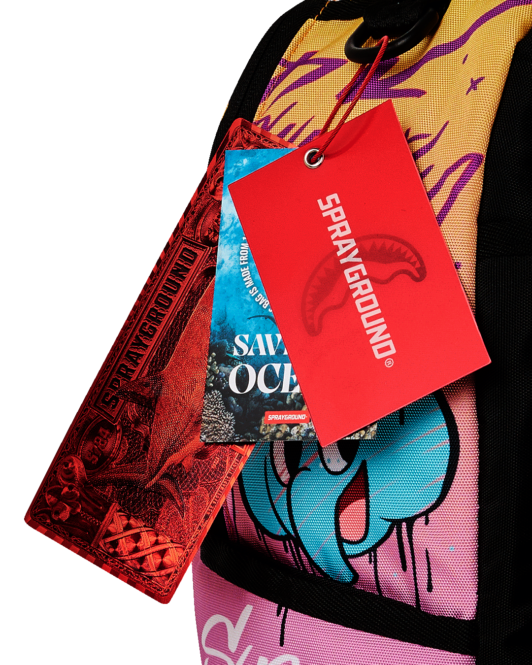 Dimensions: 18" x 6" x 11.5" • Front zipper pocket • Side pockets • Zippered Stash pocket • Separate velour sunglass compartment • Ergonomic mesh back padding • Adjustable Straps for custom sizing • Gold zippers with metal hardware • Metal "Sprayground Authentic" badge • Slide through back sleeve connects to carry-on luggage to free your hands