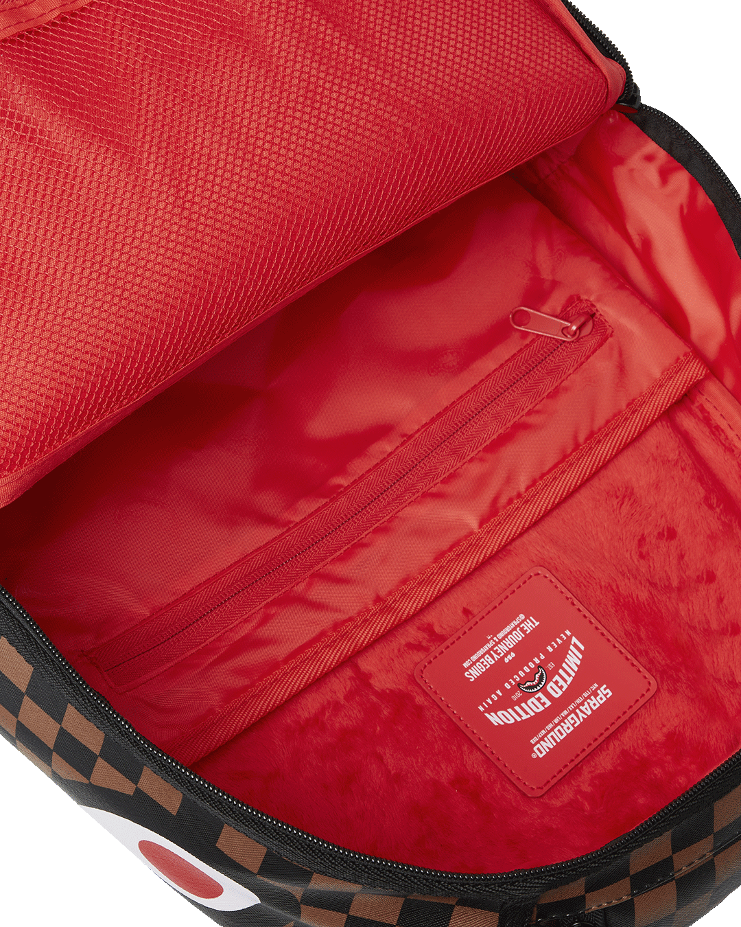 Dimensions: 18" x 6" x 11.5" • Front zipper pocket • Side pockets • Zippered Stash pocket • Separate velour sunglass compartment • Ergonomic mesh back padding • Adjustable Straps for custom sizing • Gold zippers with metal hardware • Metal "Sprayground Authentic" badge • Slide through back sleeve connects to carry-on luggage to free your hands