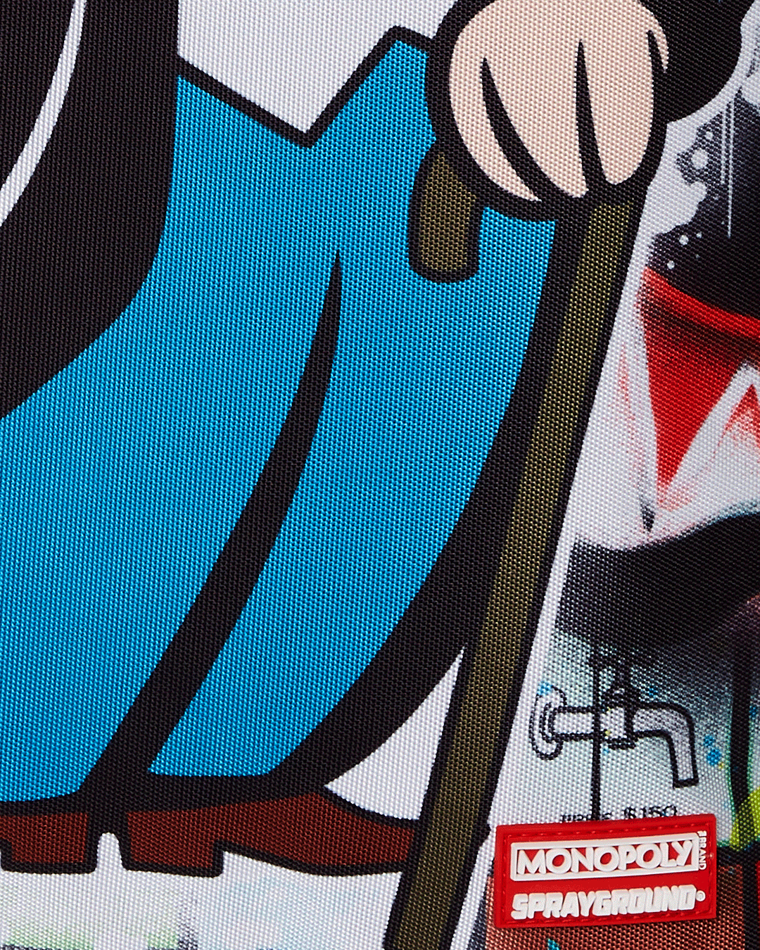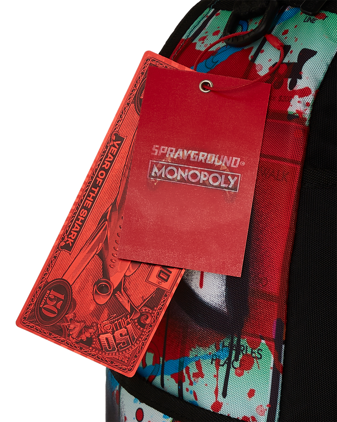 Dimensions: 18" x 6" x 11.5" • Front zipper pocket • Side pockets • Zippered Stash pocket • Separate velour sunglass compartment • Ergonomic mesh back padding • Adjustable Straps for custom sizing • Gold zippers with metal hardware • Metal "Sprayground Authentic" badge • Slide through back sleeve connects to carry-on luggage to free your hands