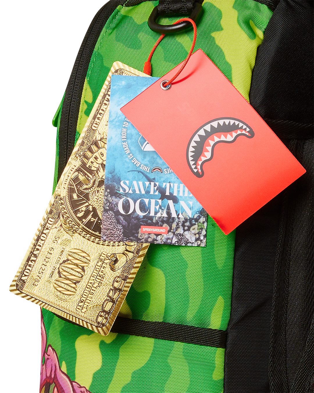 Dimensions: 18" x 6" x 11.5" • Front zipper pocket • Side pockets • Zippered Stash pocket • Separate velour sunglass compartment • Ergonomic mesh back padding • Adjustable Straps for custom sizing • Gold zippers with metal hardware • Metal "Sprayground Authentic" badge • Slide through back sleeve connects to carry-on luggage to free your hands