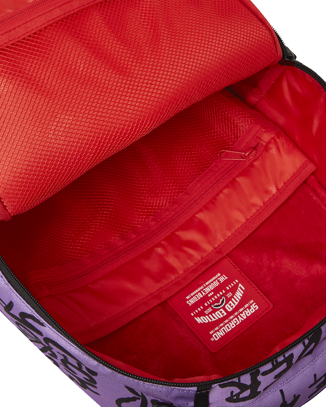 Dimensions: 18" x 6" x 11.5" • Front zipper pocket • Side pockets • Zippered Stash pocket • Separate velour sunglass compartment • Ergonomic mesh back padding • Adjustable Straps for custom sizing • Gold zippers with metal hardware • Metal "Sprayground Authentic" badge • Slide through back sleeve connects to carry-on luggage to free your hands