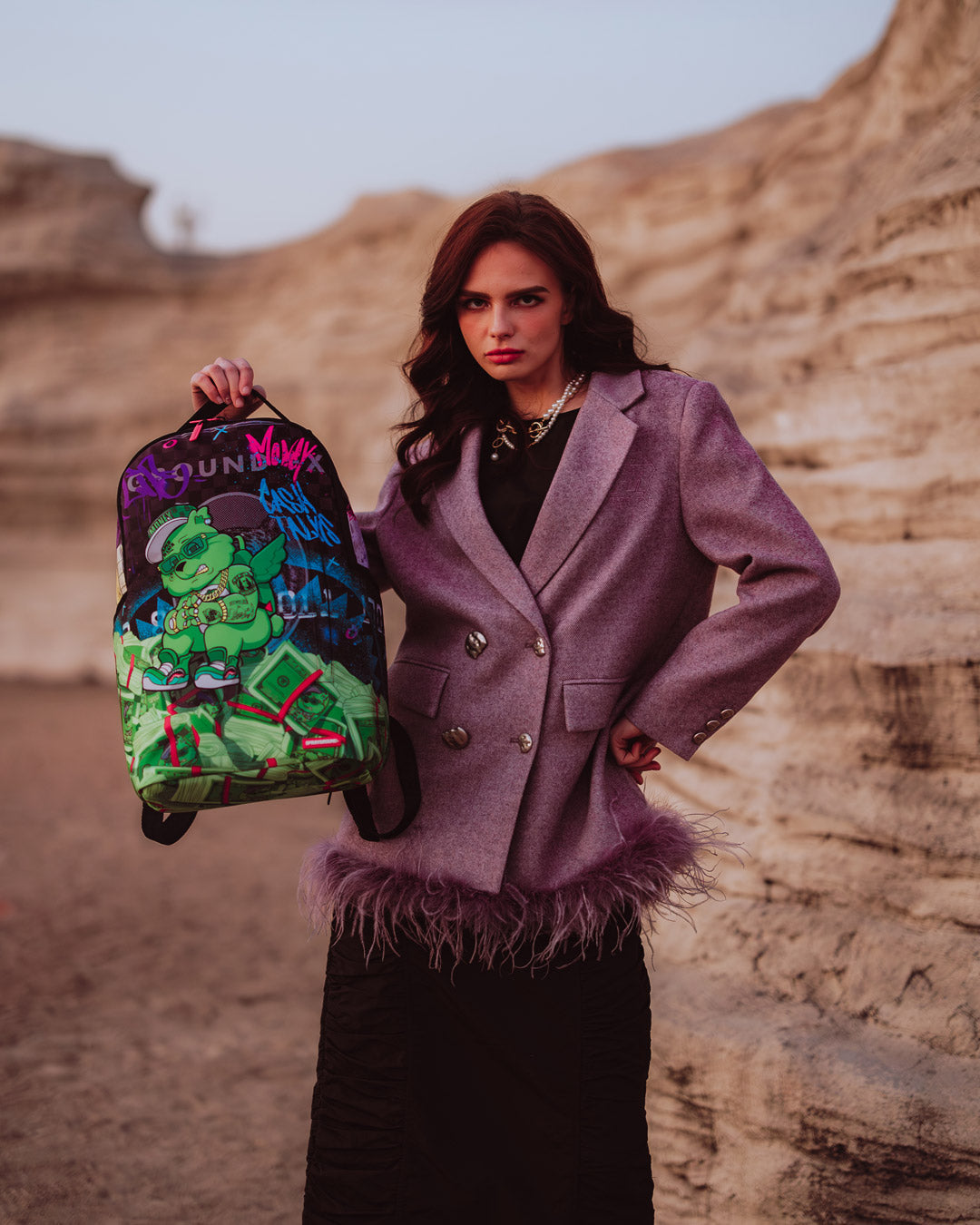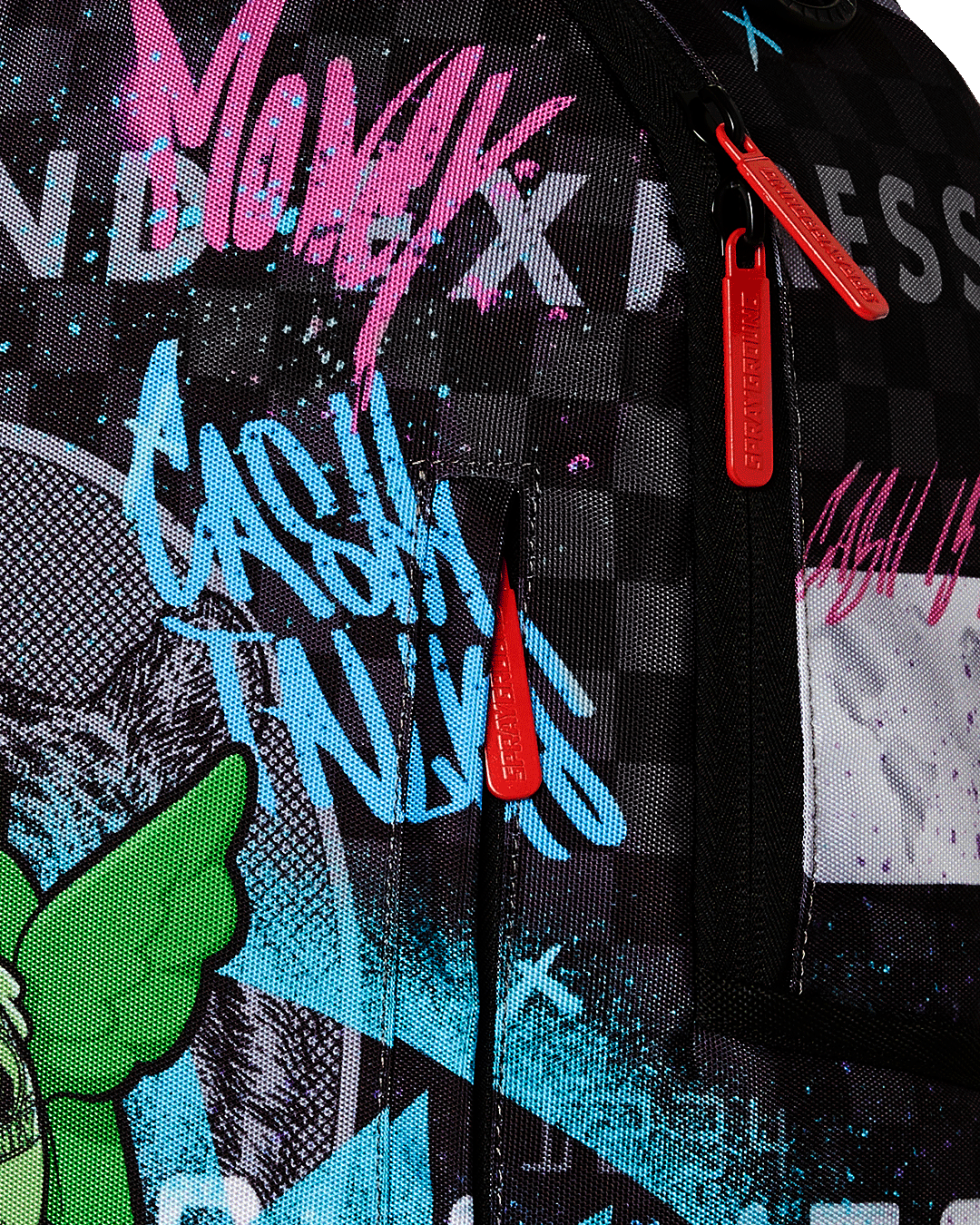 Dimensions: 18" x 6" x 11.5" • Front zipper pocket • Side pockets • Zippered Stash pocket • Separate velour sunglass compartment • Ergonomic mesh back padding • Adjustable Straps for custom sizing • Gold zippers with metal hardware • Metal "Sprayground Authentic" badge • Slide through back sleeve connects to carry-on luggage to free your hands