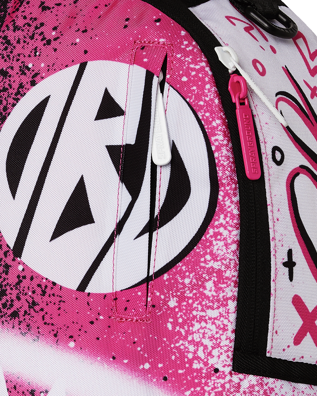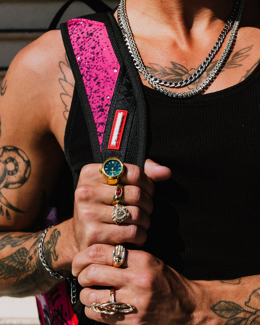 Dimensions: 18" x 6" x 11.5" • Front zipper pocket • Side pockets • Zippered Stash pocket • Separate velour sunglass compartment • Ergonomic mesh back padding • Adjustable Straps for custom sizing • Gold zippers with metal hardware • Metal "Sprayground Authentic" badge • Slide through back sleeve connects to carry-on luggage to free your hands
