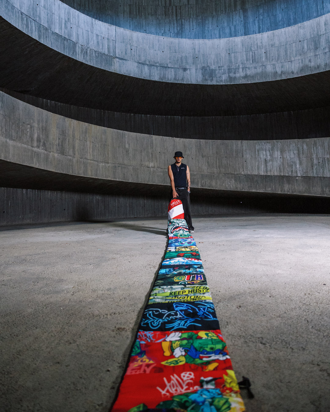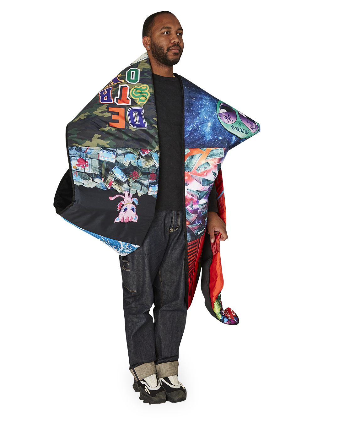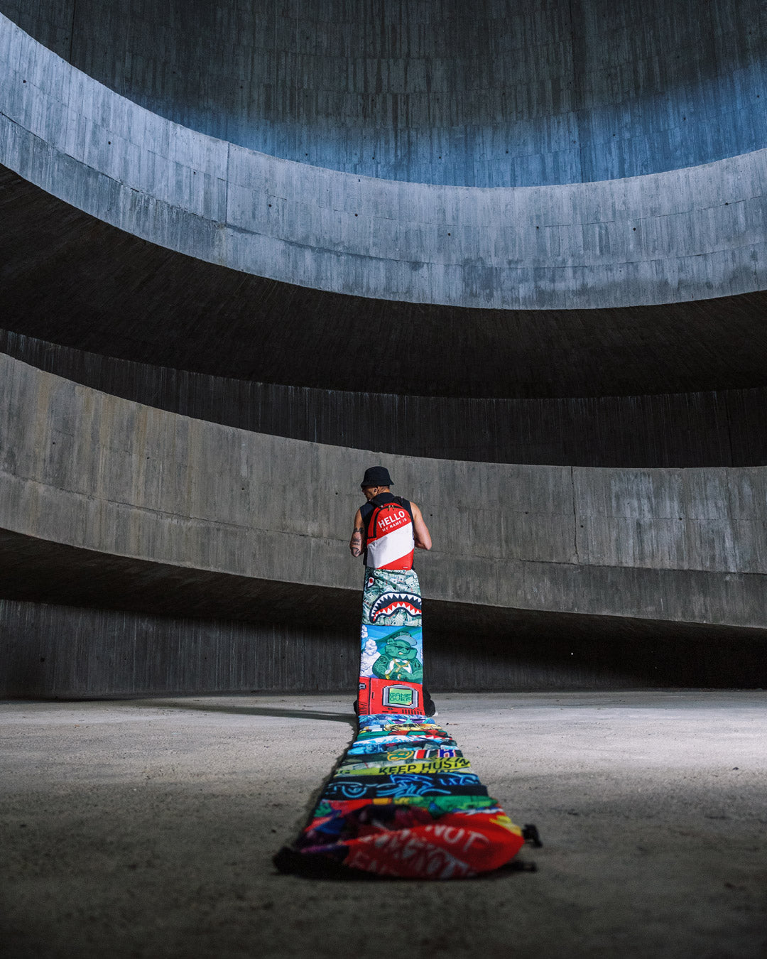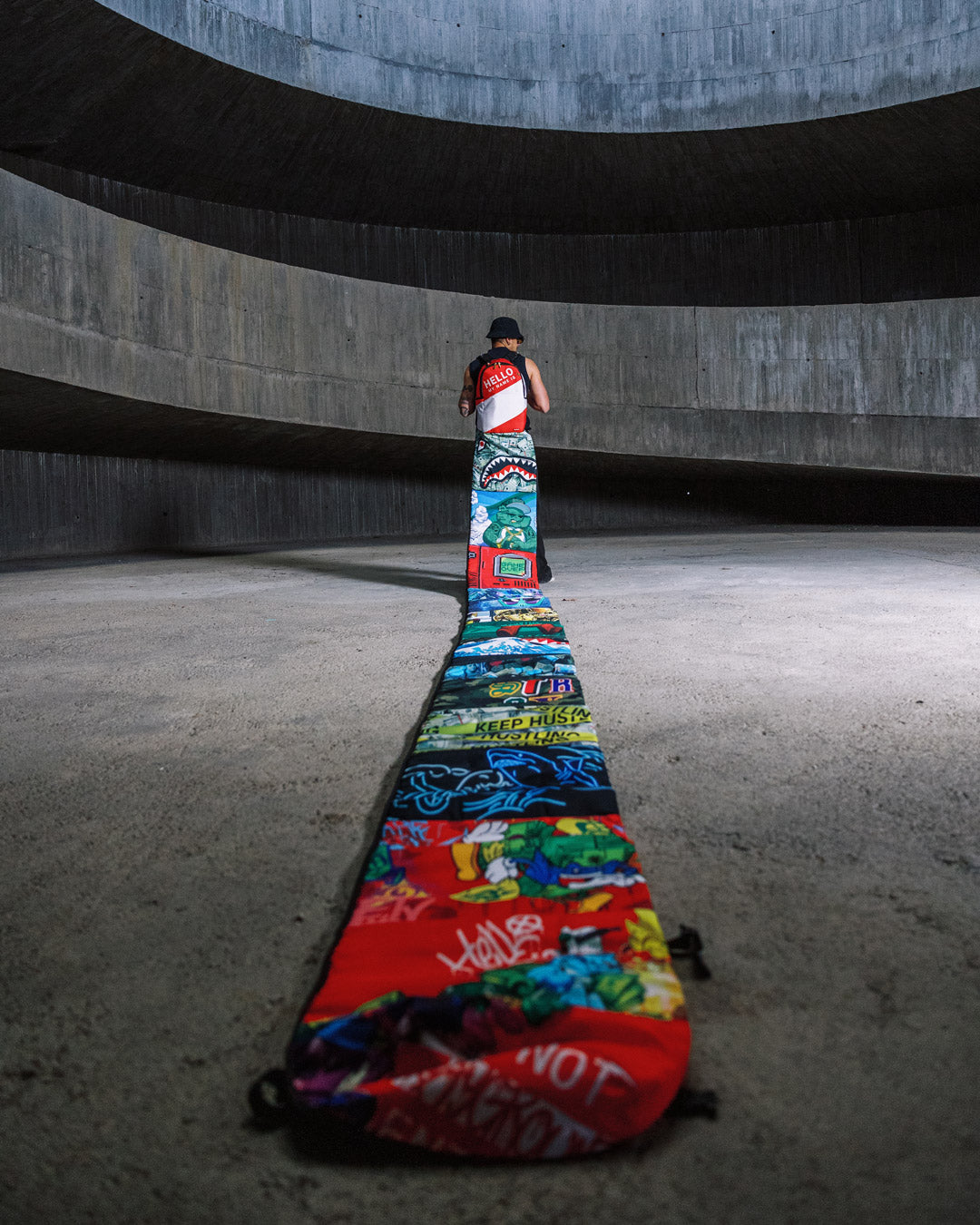 One of a kind backpack for our 15 year anniversary, featuring a train of 15 different art designs. The top bag is fully functional. The train does not have any pockets it is purely for style. It is 22 ft. long, polyester, features a strap to fasten the train when rolled up, and exclusive 15 year backpack details.